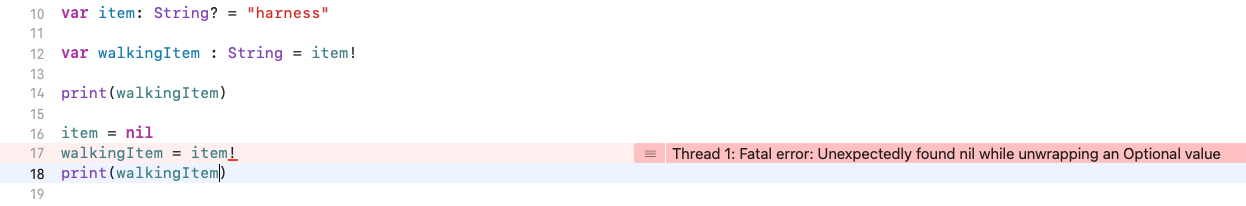 강제 추출은 옵셔널을 추출하는 가장 간단한 방법이다. 옵셔널의 뒤에 물음표(?)를 붙여주면 된다. 이 때, 옵셔널 안의 값이 nil이라면 런타임 오류가 생긴다.