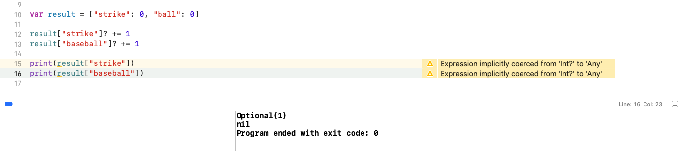 result["strike"]에 접근하기 위해서 물음표(?)를 사용하는 것이 맞는 것일까? result["strike"]는 Optional(변수)라고 했다. 여기에 물음표(?)를 붙이는 것은 무슨 의미인가? 바로 옵셔널 체이닝을 사용한 것이다! 옵셔널 바인딩을 사용하지 않으면서 로직을 수행하기 위해 물음표(?)를 붙여준 것이라고 볼 수 있다.