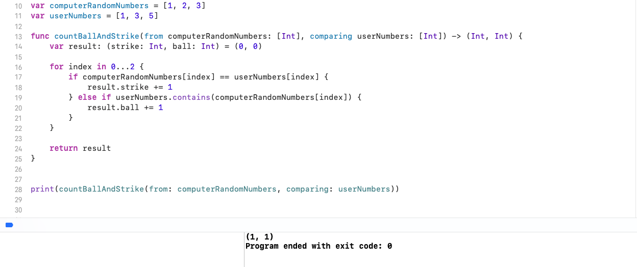 임의로 숫자를 넣어서 프린트 해봤다. 튜플을 사용한다면, 이런 형태로 반환이 될 것이다. 그렇다면, 튜플을 사용하는 것의 장점은 무엇일까? 결과값을 바인딩할 필요가 없어진다. 엊그제 공부했다싶이 딕셔너리의 value는 옵셔널이다. 그래서 다른 함수에서 strike와 ball의 결과를 사용하면서 바인딩을 해주었다.