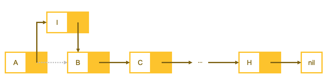 중간 element를 삽입할 때에도 비슷하다. B를 가리키는 Node가 I를 가리키도록 하고, I의 노드는 B를 가리키면 된다.