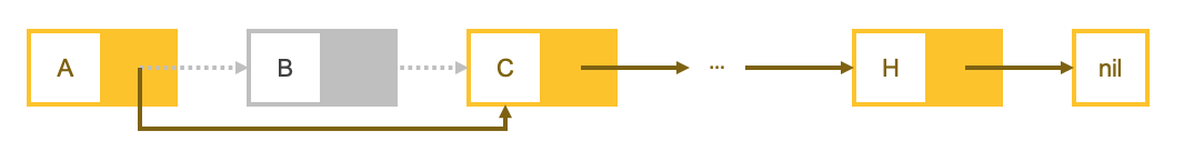 중간 element를 삭제할 때에는 위 그림처럼 삭제하고자하는 element를 가리키는 Node를 그 다음 element를 가리키도록 하면 된다. 즉, B를 가리키는 Node가 C를 가리키도록 하면 된다.